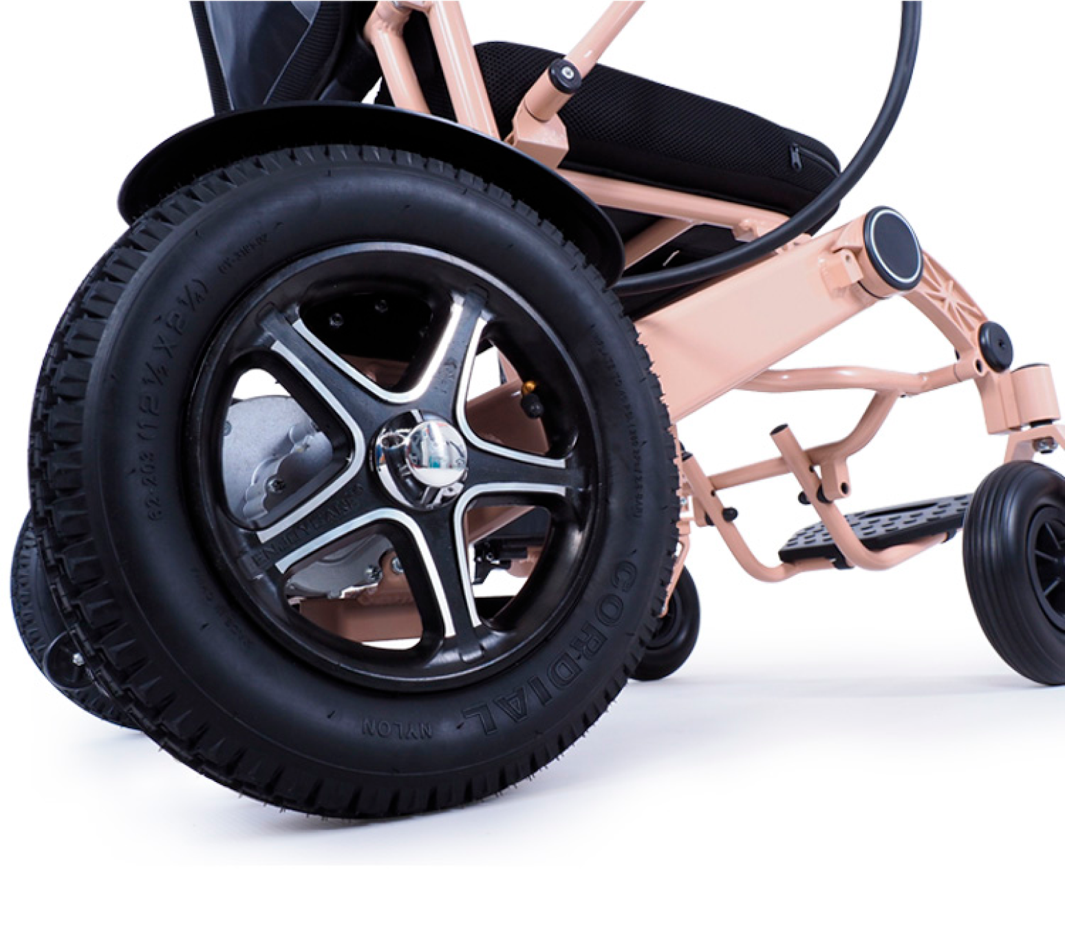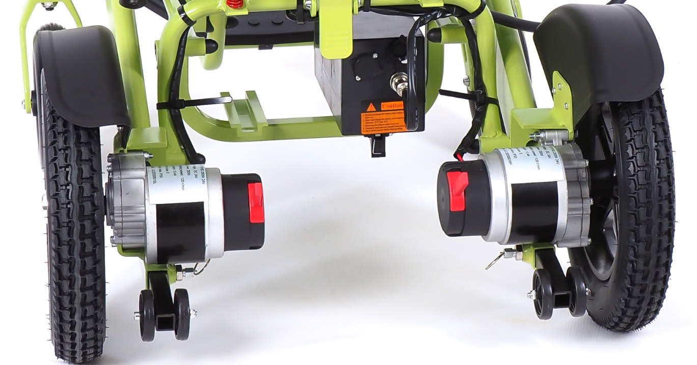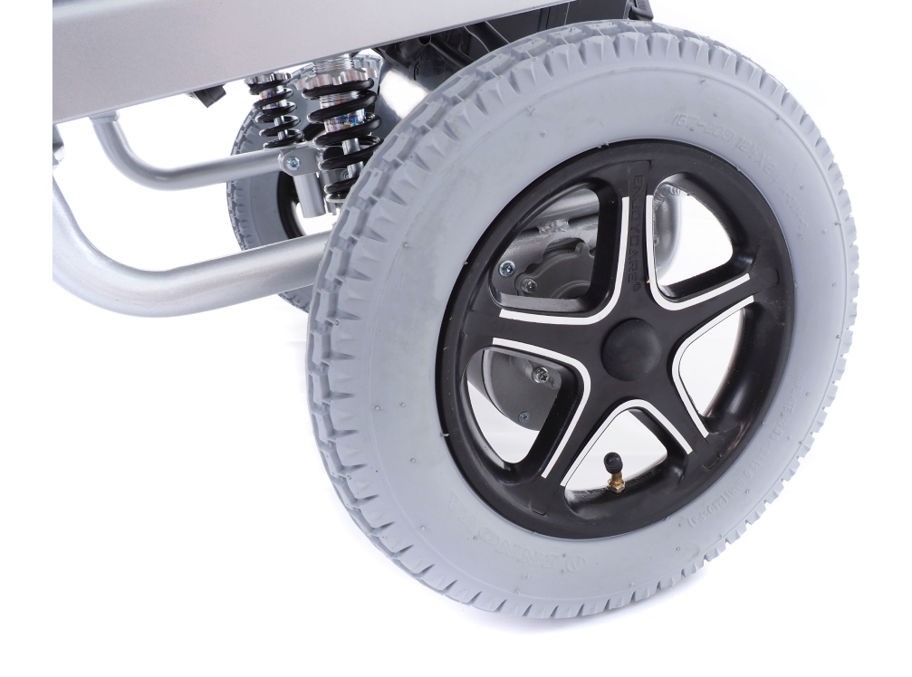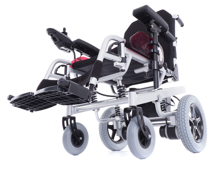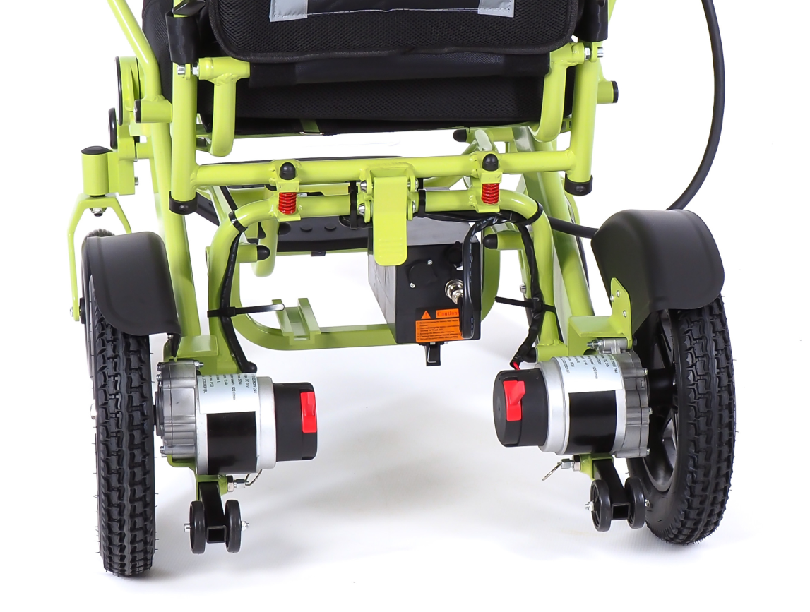 Данная инвалидная коляска оснащена двумя современными энергоэффективными моторами (по 250 Ватт каждый) и классическим свинцовым аккумулятором. Несмотря на демократичную цену, в оснащение коляски входят автоматические электромагнитные тормоза, что значительно повышает безопасность и упрощает использование коляски на склоне или пандусе.