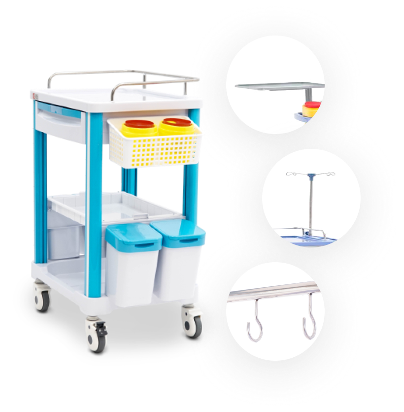 Дополнительное «навесное» оборудование позволяет кастомизировать столы и тележки под необходимую специфику лечебного учреждения. Это оборудование можно использовать для закрепления кислородного баллона, контейнеров, доски для СЛР или держателя монитора.